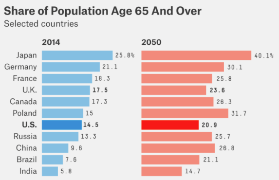 Demographic fundamentals drive supply and demand and since consumer spending is such a big part of economies today, as individuals and societies we have to prepare for this change. Japan, as well has an aging population problem and combined with national debt can be expected to be several impacted by this trend. Countries that are traditionally less inclined to be open to high-rates of immigration will try to automatize more services, which could lead to mixed results.